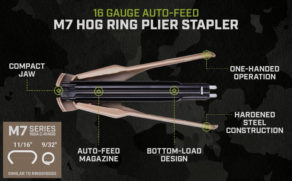 The Spec OpsTools 16-Gauge Auto Feed Hog Ring Plier is designed for efficiency and durability, featuring an auto-feed magazine that holds 50 hog rings, a compact jaw for tight spaces, and a robust steel construction. With a commitment to giving back, 3% of all sales support veteran and first responder causes, making this tool not just functional but also socially responsible.
