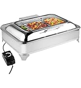 The YMJOINMX Electric Round Chafing Dish Buffet Set features a 6-quart stainless steel warmer with a transparent glass lid and hydraulic hinge for smooth operation. It offers precise temperature control from 95°F to 185°F, making it perfect for professional or home catering to keep food warm and visually appealing.