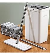 The JOYMOOP Mop and Bucket Set features a hands-free wringer with wet/dry separation, a flat mop head designed for tight spaces, and three high-intensity washable microfiber pads. Its lightweight, rust-resistant design and multi-surface compatibility make it a top choice for efficient, hygienic floor care.