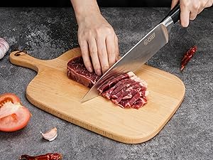 The media could not be loaded. I was in search of a quality Chef's Knife to add to my knife set. This is a full tang knife so there isn't any concern about the blade breaking away from the handle. It is very solid and extremely sharp! It came in a nice box with a sharpening tool so it would also make a great gift.I do a ton of cooking at home and go through a lot of fresh vegetables and fruits. I also prepare a lot of fresh meat so this will make my prep time go much smoother. It doesn't take much effort to cut due to the blade sharpness and the weight of the knife. This has cut down on my meal prep time and made the process enjoyable. This is a great chef's knife and I'd recommend it to anyone looking to add to their set!