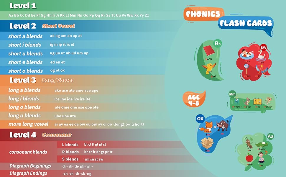 Phonics Flash Cards - Learn to Read Sight Word Cards, Digraphs, CVC Blends, Long Vowel Sounds, Phonics Games for Kids Ages 4-8 Kindergarten, First Second Grade, Educational Study Activity