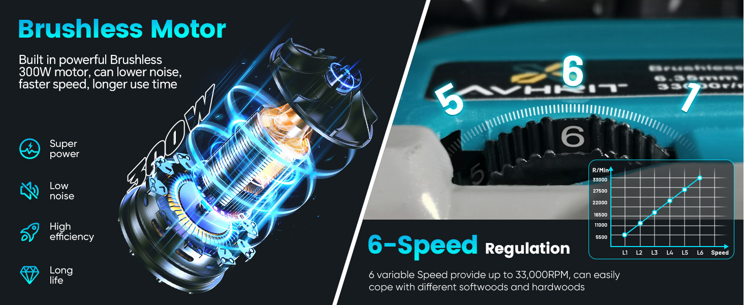 The Avhrit Cordless Compact Wood Palm Router is a professional-grade, battery-powered woodworking tool featuring a brushless motor delivering up to 33,000 RPM. Equipped with two 4.0Ah lithium polymer batteries, it offers cordless convenience and extended runtime. Its 6-speed settings and quick-release cam lock enable precise depth control, while the included 15-piece 1/4" router bit set covers a wide range of cutting and trimming needs. Designed with a durable aluminum body and ergonomic features, this router is ideal for indoor and outdoor woodworking, furniture making, and DIY projects.