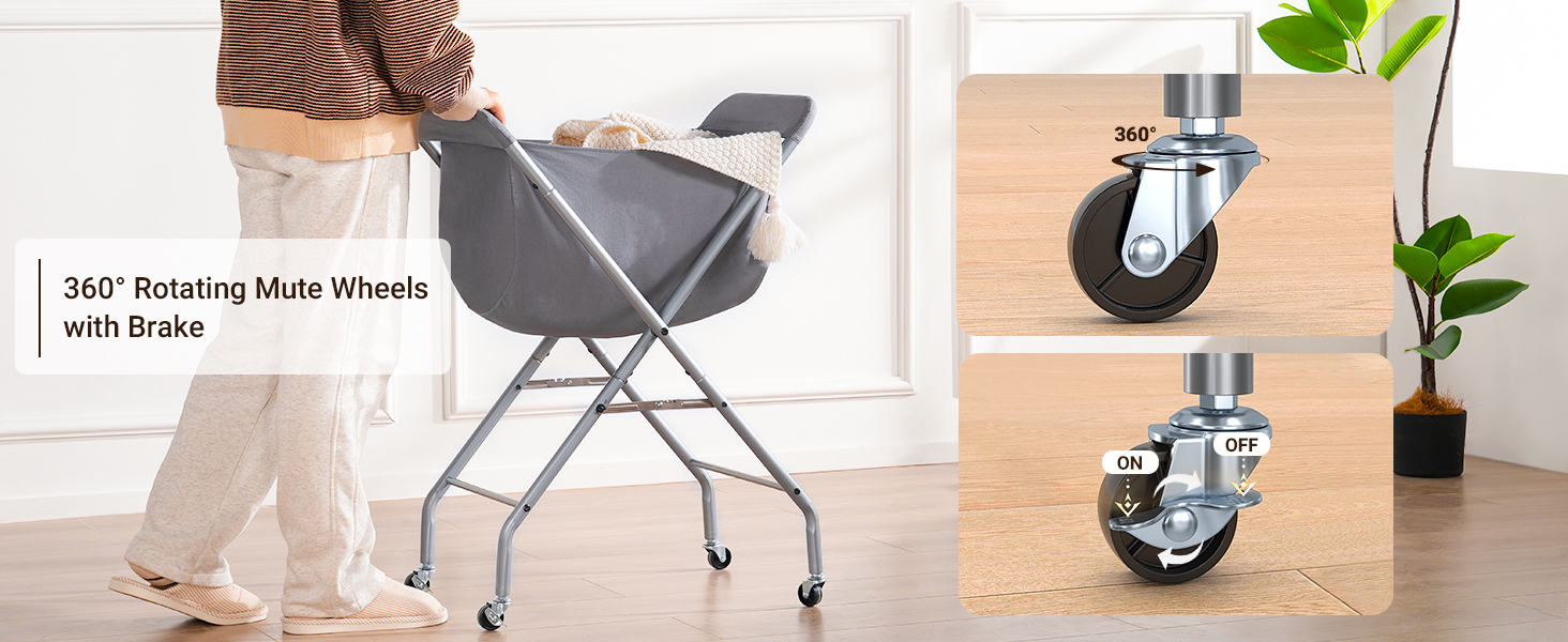 The ELYKEN Laundry Cart combines a sturdy iron frame with 4 smooth casters and 2 locking brakes for effortless, controlled mobility. Standing 32 inches tall, it eliminates bending strain, while its removable, machine-washable 52L cotton liner and side pocket keep laundry organized. Foldable for space-saving convenience, this modern hamper is designed to streamline your laundry routine with style and durability.