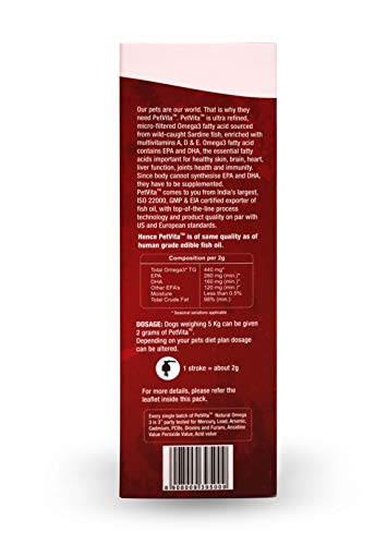 I used petvita on my Golden Retriever. She had hair falls and had skin problems. Just had a quick reference with my doctor to ask if giving omega 3 was beneficial. Doctor said omega 3 (especially fish oil) is a very essential thing for the dogs as it contain many essential fatty acids. After few online research i finally tried Petvita. It had raw smell of fish. She had no problem in taking the product ,i mixed it with food and gave. Also they have maintained a card inside the package which i felt very helpful as proper dosage according to the weight has been mentioned. In about 2 weeks i could see amazing results on her. I would definitely recommend this product to all dog lovers out there. An excellent product and am 100% satisfied.
