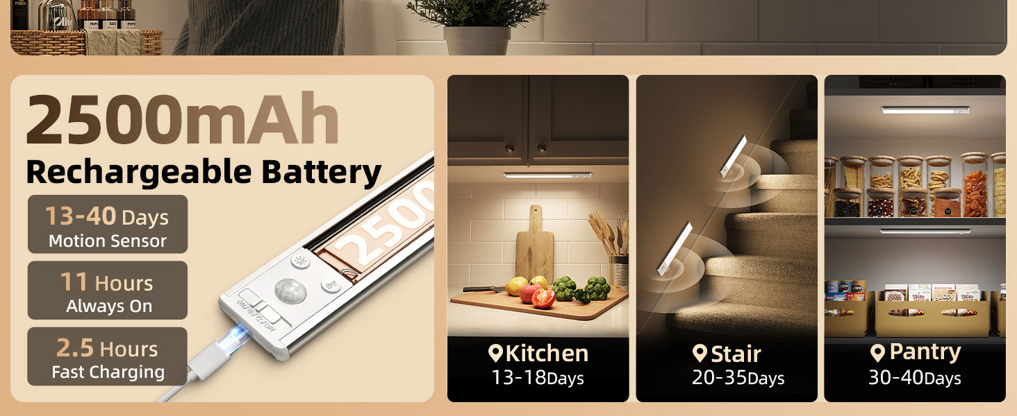 The EZVALO Under-Unit Light Kitchen 25 cm features 80 bright LEDs with a PIR motion sensor offering 4 modes including day and night auto activation. Powered by a robust 1900 mAh rechargeable battery, it lasts up to 60 days on motion mode or 6-7 hours on full brightness. With 3 adjustable color temperatures and dimmable settings, plus easy magnetic installation, it’s the ultimate wireless cabinet lighting solution for modern living spaces.