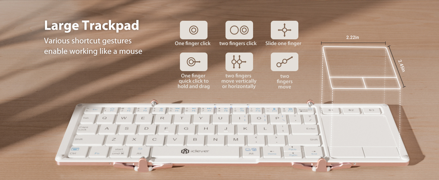 The iClever BK08 is a compact, foldable Bluetooth keyboard with an integrated touchpad, designed for professionals on the move. It supports seamless switching between three devices, offers broad compatibility across major operating systems, and features a USB-C rechargeable battery for reliable, long-lasting performanceâall wrapped in a stylish pink-white finish.